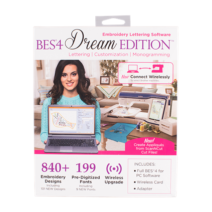 BES 4 Dream Edition; Embroidery Lettering Software is a true innovation in embroidery lettering, monogramming & customization software. BES 4 is a full-featured desktop software that offers all the great features of BES 3, and more. Plus, BES 4 includes a new wireless upgrade for select Brother machines, and a convenient BES Cloud web application for free storage and basic editing capabilities.