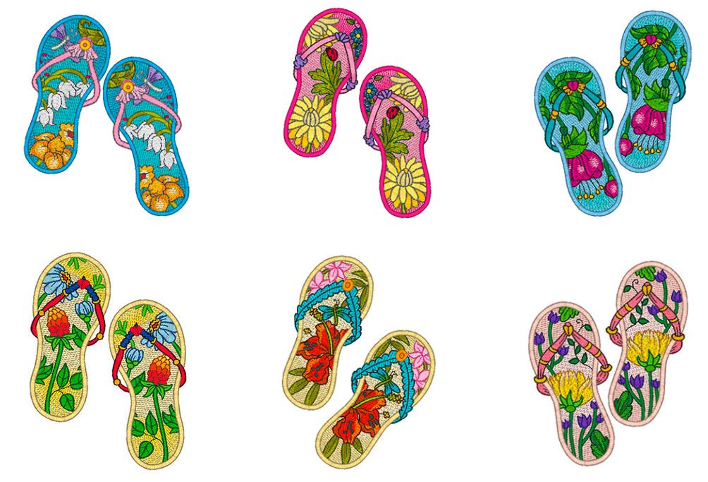 Mylar Flip Flops 2 is a fun collection of Summertime flip flops that shimmer like sand with Mylar Embroidery ®. Tropical flowers and bright, colorful designs make this machine embroidery collection a must for sand and sun, pick up your copy today!
