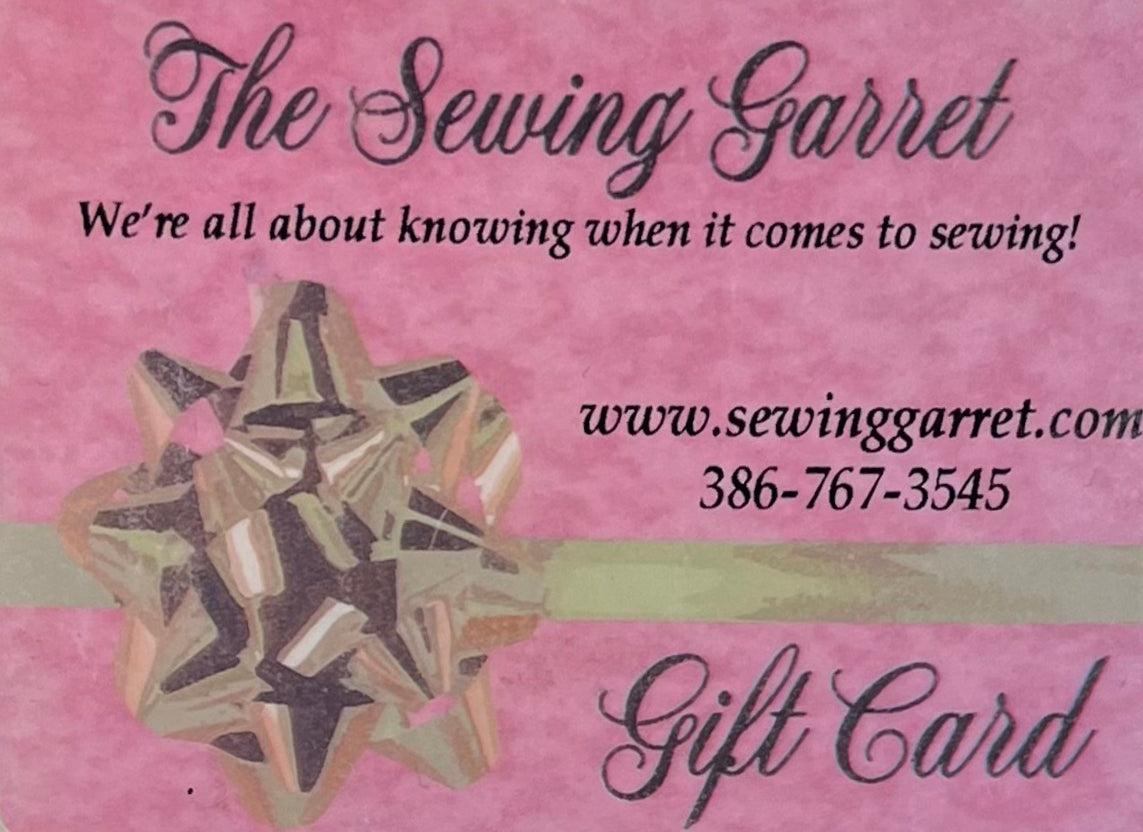 Not sure what to buy your Sewing & Embroidery Enthusiast? A Sewing Garret Card is perfect. Pay for the card and we will contact you to mail to you or you can pick it up in our store. For questions on how to redeem online, call us at (386) 767-3545.